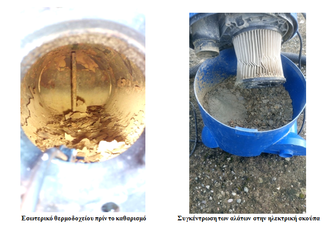 Στη συνέχεια το θερμοδοχείο καθαρίζεται με ειδικά εργαλεία, ώστε να αποκοληθούν τα άλατα από το εσωτερικο του και κατόπιν αυτά αναρροφώνται με ειδική σκούπα. Το θερμοδοχείο τέλος πλένεται με νερό και επανέρχεται στην αρχική του κατάσταση.